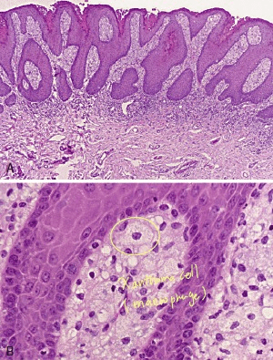 | Squamous papilloma | HPV 6,11 30-50 y/o 舌頭,軟顎 Exophytic Pedunculated | Keratinized stratified squamous epithelium “Koilocye” 空泡細胞 – 在棘層底部,濃染 |