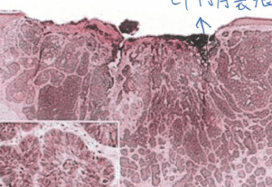 最常見的皮膚癌,不大可能出現在口腔,可能附近會血管擴張,Tumor cell很顯濃染,往下會吃到connective tissue